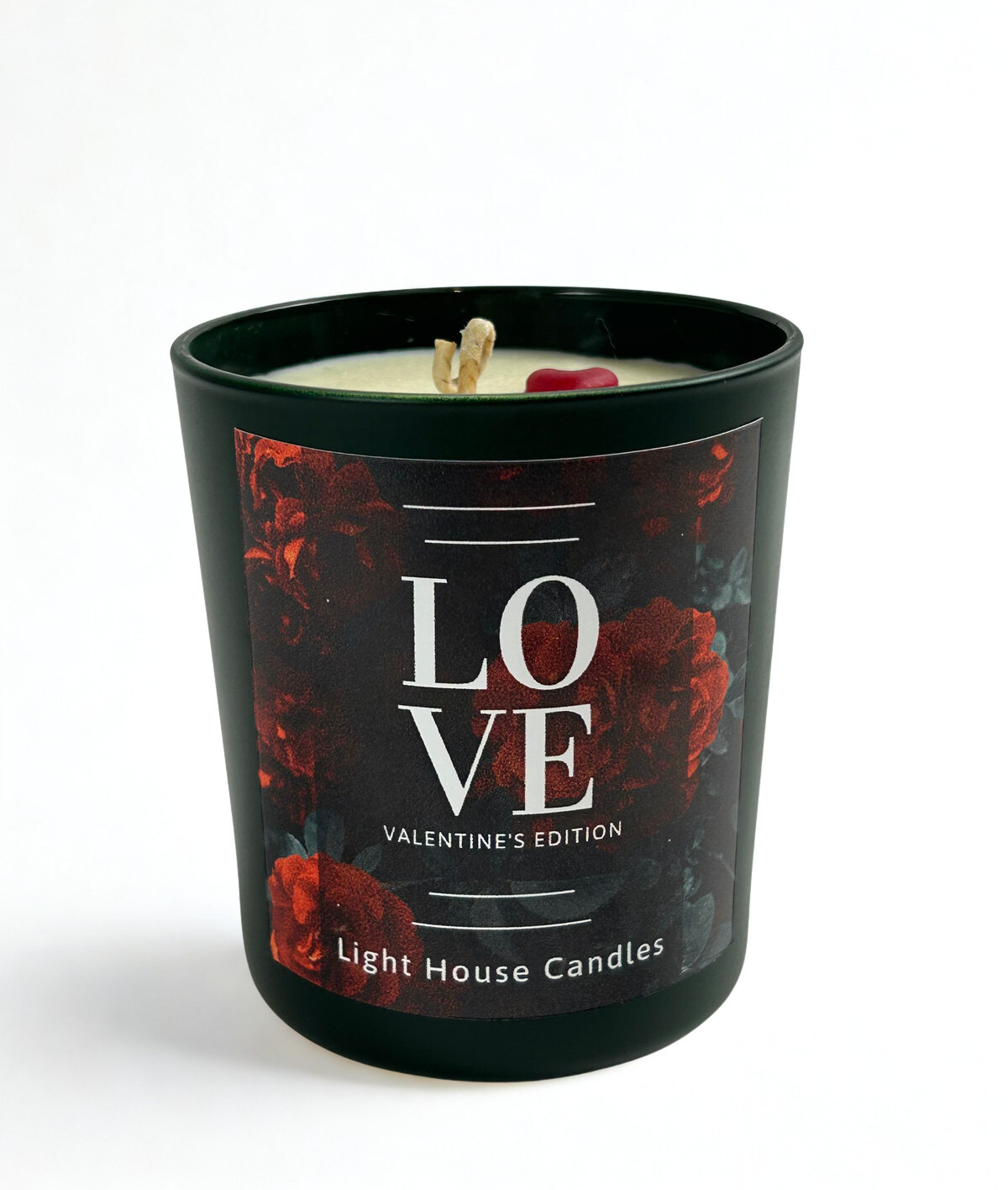 Χειροποίητο αρωματικό κερί από 100% φυτικό κερί σόγιας, τοποθετημένο σε minimal μαύρο δοχείο με τη συλλεκτική ετικέτα “LOVE – Valentine’s Edition”. Δημιουργημένο για να προσφέρει μια ζεστή και ρομαντική ατμόσφαιρα, αποτελεί μια κομψή πρόταση διακόσμησης αλλά και ένα ιδιαίτερο δώρο για την ημέρα του Αγίου Βαλεντίνου.