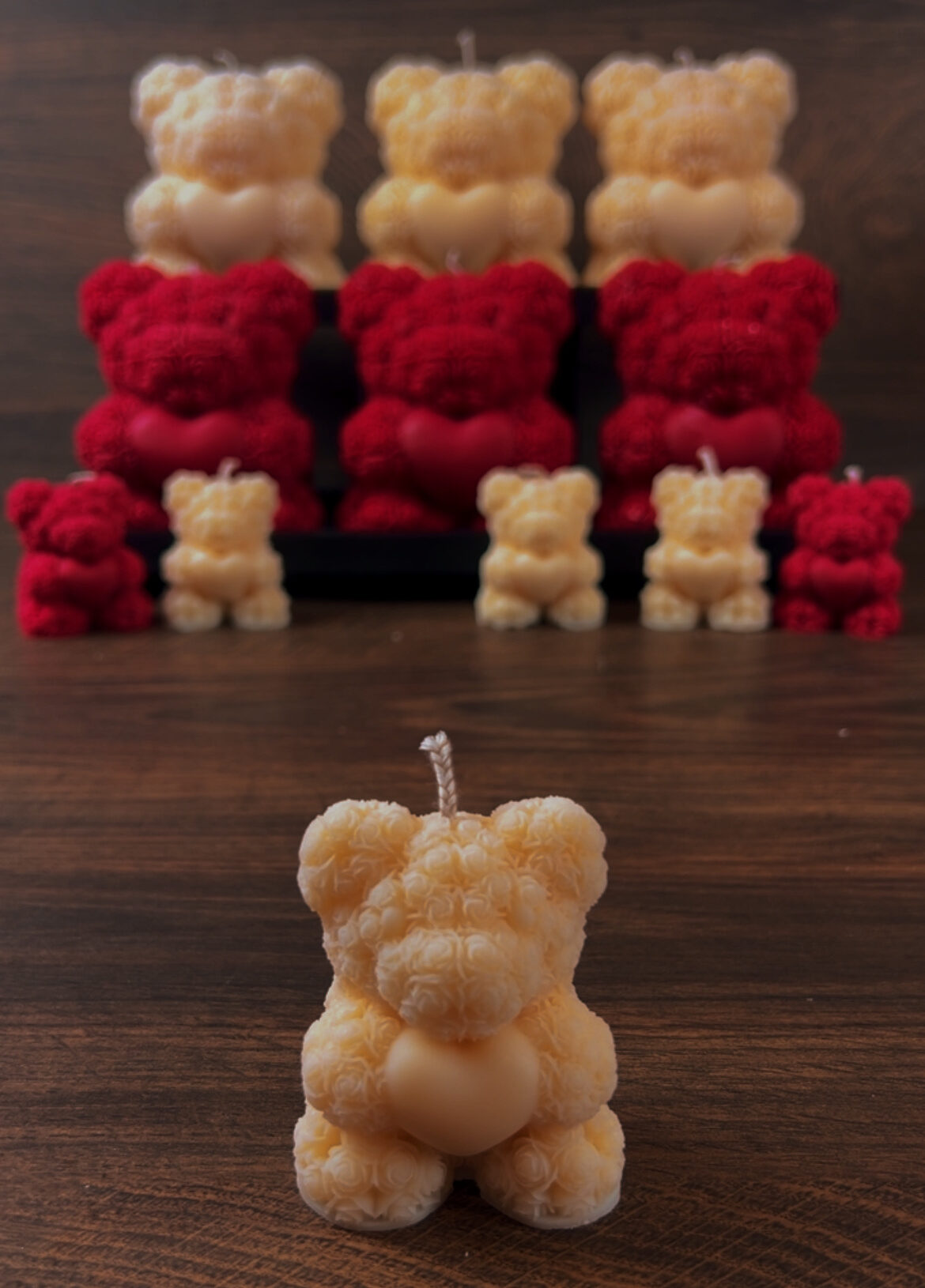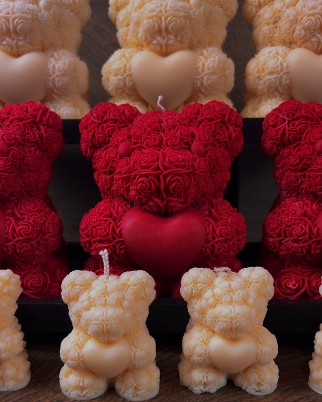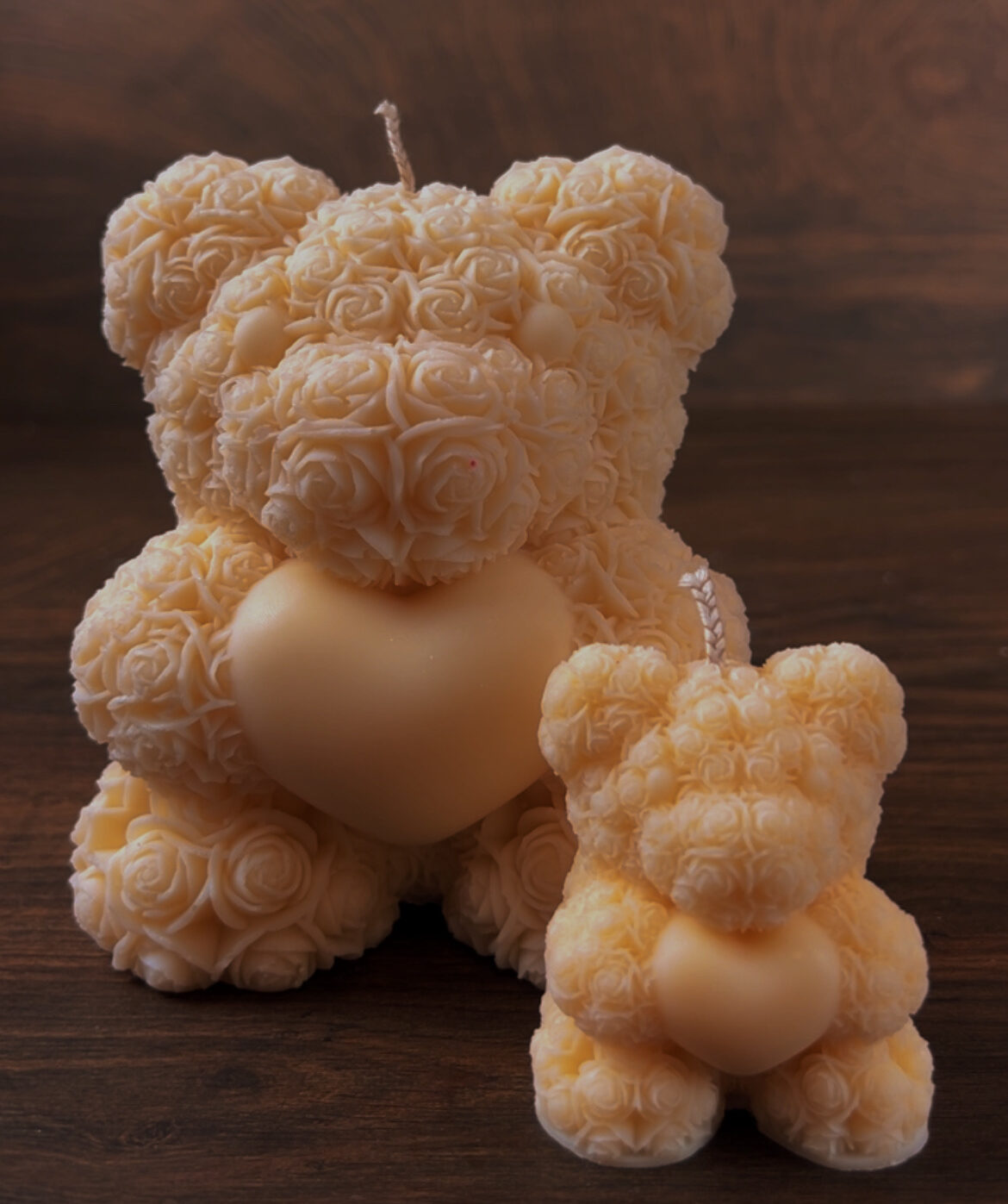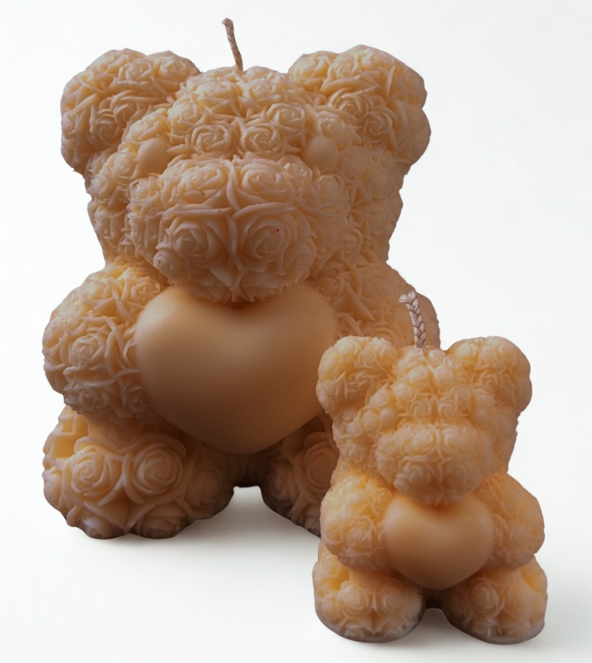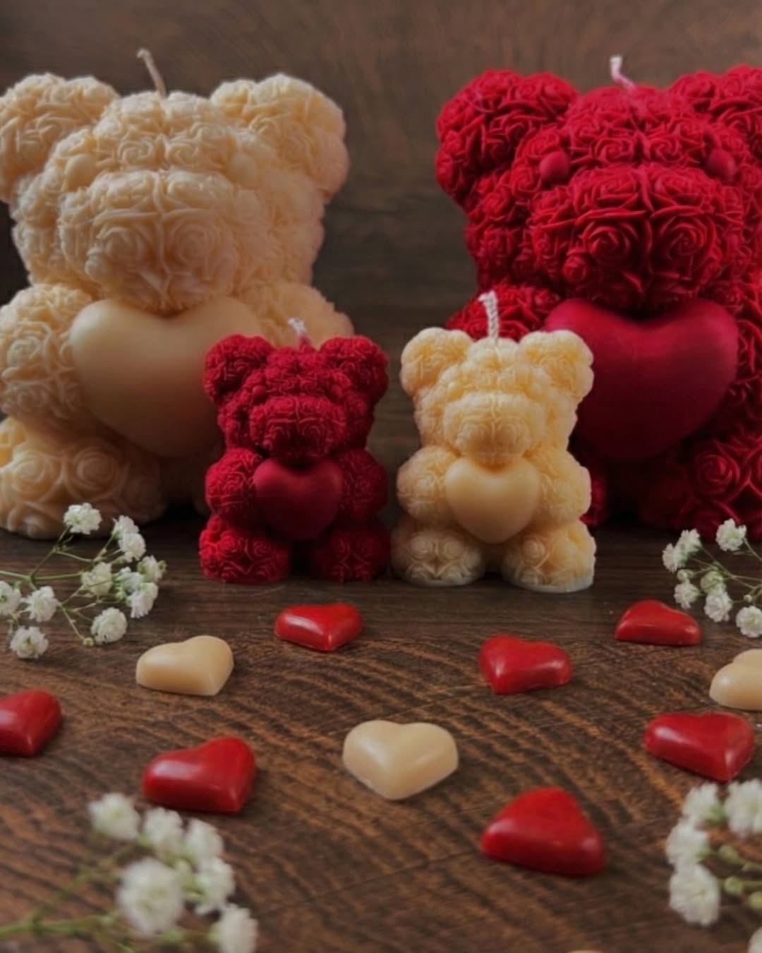 Χειροποίητο κερί σε σχήμα αρκουδιού με τριαντάφυλλα προσεκτικά κατασκευασμένο από 100% φυτικό κερί σόγιας και εμποτισμένο με υψηλής ποιότητας αρωματικά έλαια, συνδυάζοντας ρομαντισμό και εκλεπτυσμένη αισθητική. Οι γλυπτές λεπτομέρειες του τριαντάφυλλου και το εντυπωσιακό μεγάλο μέγεθος του, το καθιστούν ένα μοναδικό διακοσμητικό στοιχείο, ιδανικό για την Ημέρα του Αγίου Βαλεντίνου, επετείους ή οποιαδήποτε άλλη σημαντική περίσταση.